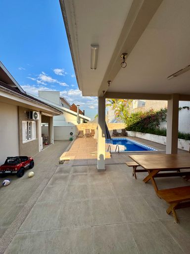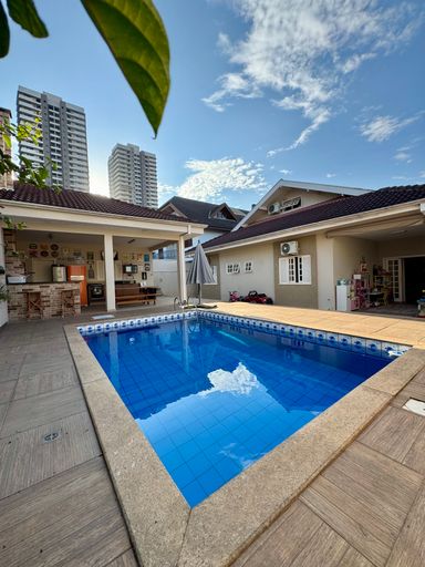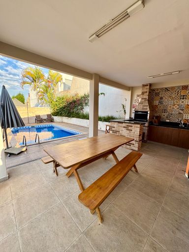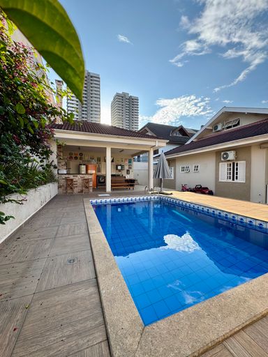 Na área externa, o lazer é completo: piscina, espaço gourmet com churrasqueira e quarto de apoio tornam a experiência ainda mais especial para reunir família e amigos.